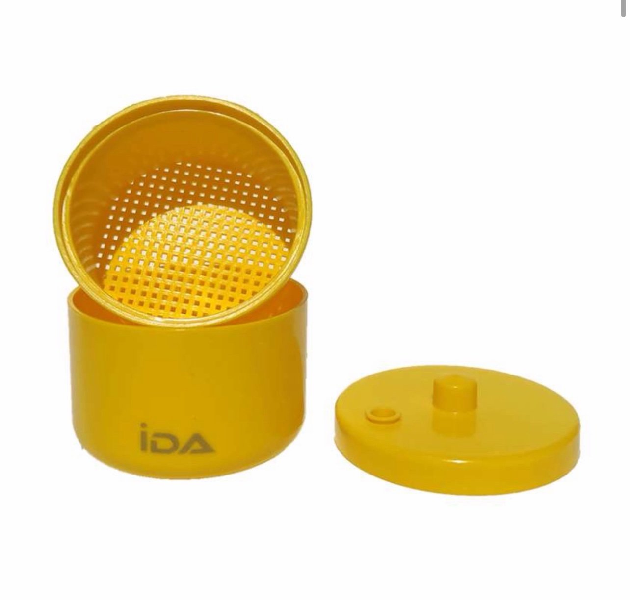 Desinfectiebox met zeef voor tandheelkundige boren. Handig en autoclaveerbaar, ontworpen voor snelle reiniging.