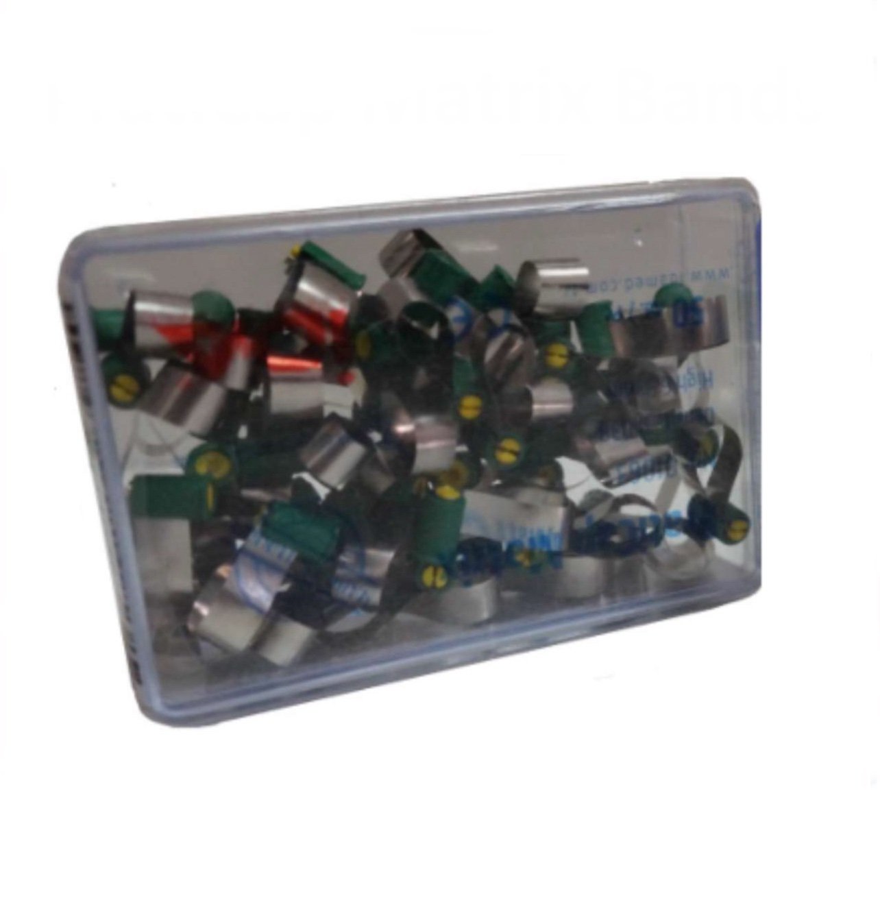 Snelle en praktische matrixbanden (molaar en premolaar) in metaal of transparant. Verkrijgbaar in 2 diktes (0,038 en 0,025 micron). Set van 50, compatibel met standaard spanningstools.